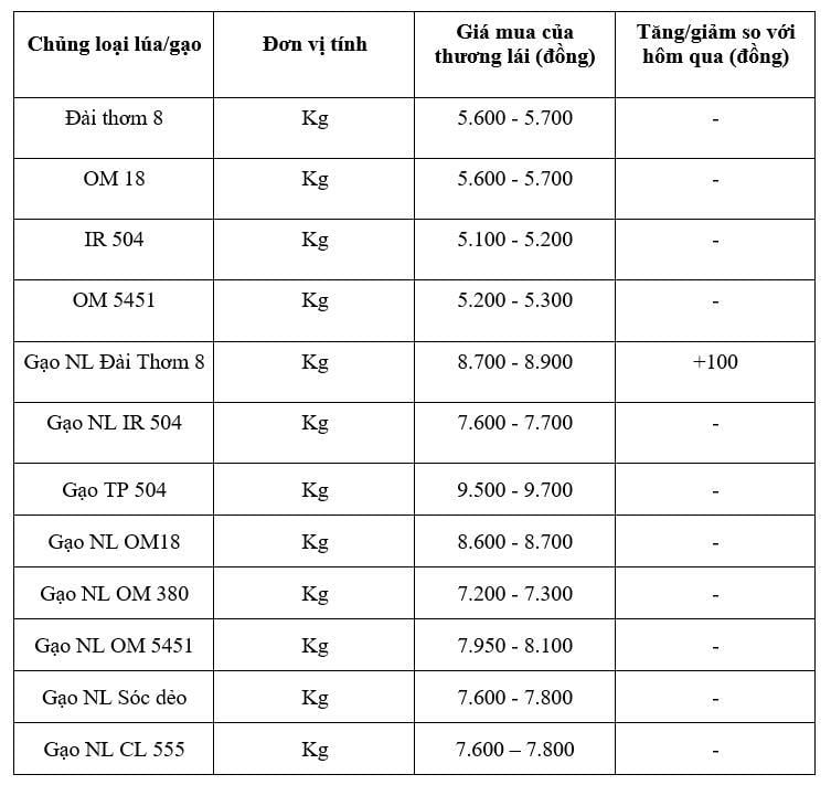 Tương tự với mặt hàng gạo, theo cập nhật từ Sở Nông nghiệp và Môi trường tỉnh An Giang và Lúa gạo Việt, hiện gạo Đài Thơm 8 tăng 100 đồng/kg dao động 8.700 - 8.900 đồng/kg; gạo nguyên liệu xuất khẩu OM 380 dao động ở mức 7.200 - 7.300 đồng/kg; gạo nguyên liệu xuất khẩu Sóc dẻo dao động ở mức 7.600 - 7.800; gạo nguyên liệu xuất khẩu IR 504 dao động ở mức 7.600 - 7.700 đồng/kg; gạo nguyên liệu xuất khẩu OM 5451 dao động ở mức 7.950 - 8.100 đồng/kg; gạo nguyên liệu xuất khẩu CL 555 dao động ở mức 7.600 - 7.800 đồng/kg; gạo nguyên liệu xuất khẩu OM 18 dao động ở mức 8.500 - 8.600 đồng/kg; gạo thành phẩm IR 504 dao động ở 9.500 - 9.700 đồng/kg so với hôm qua.