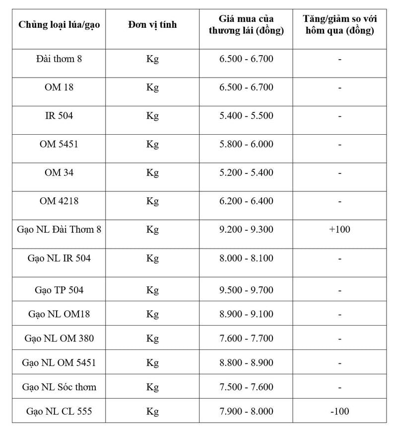 Tương tự với mặt hàng lúa, theo cập nhật từ Sở Nông nghiệp và Môi trường tỉnh An Giang, hiện giá lúa tươi IR 50404 dao động ở mức 5.400 - 5.500 đồng/kg; giá lúa OM 5451 (tươi) dao động mốc 5.800 - 6.000 đồng/kg; giá lúa OM 4218 dao động 6.200 - 6.400 đồng/kg; giá lúa OM 18 (tươi) dao động ở mốc 6.500 - 6.700 đồng/kg; giá lúa Đài Thơm 8 (tươi) dao động ở mốc 6.500 - 6.700 đồng/kg; giá lúa OM 34 (tươi) dao động mốc 5.200 - 5.400 đồng/kg, so với hôm qua.