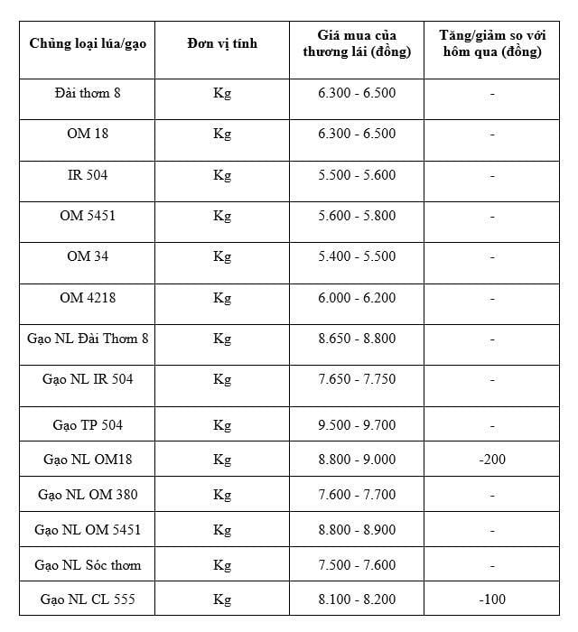 Tương tự với mặt hàng lúa, theo cập nhật từ Sở Nông nghiệp và Môi trường tỉnh An Giang, hiện giá lúa tươi OM 18 dao động ở mốc 6.300 - 6.500 đồng/kg; giá lúa Đài Thơm 8 (tươi) dao động ở mốc 6.300 - 6.500 đồng/kg; giá lúa OM 5451 (tươi) dao động mốc 5.600 - 5.800 đồng/kg; giá lúa IR 50404 (tươi) dao động ở mức 5.500 - 5.600 đồng/kg; giá lúa OM 34 (tươi) dao động mốc 5.400 - 5.500 đồng/kg; giá lúa OM 4218 dao động 6.000 - 6.200 đồng/kg, so với đầu tuần.
