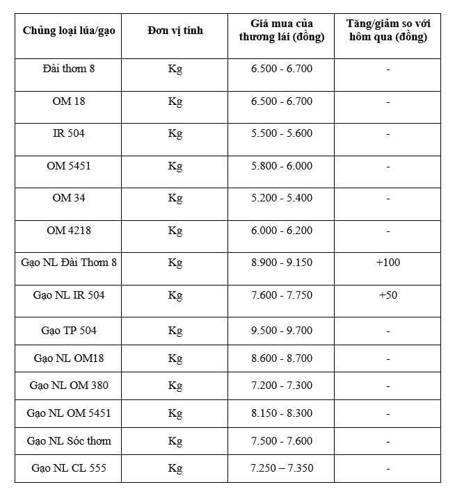 Với mặt hàng gạo, theo cập nhật từ Sở Nông nghiệp và Môi trường tỉnh An Giang và Lúa gạo Việt, hiện gạo nguyên liệu xuất khẩu IR 504 tăng 50 đồng/kg dao động ở mức 7.600 - 7.750 đồng/kg; gạo Đài Thơm 8 tăng 100 đồng/kg dao động 8.900 - 9.150 đồng/kg; hiện gạo nguyên liệu xuất khẩu OM 5451 dao động ở mức 8.150 - 8.300 đồng/kg; gạo nguyên liệu xuất khẩu Sóc thơm dao động ở mức 7.500 - 7.600 đồng/kg; gạo nguyên liệu xuất khẩu CL 555 dao động ở mức 7.340 - 7.450 đồng/kg; gạo nguyên liệu xuất khẩu OM 380 dao động ở mức 7.200 - 7.300 đồng/kg; gạo nguyên liệu xuất khẩu OM 18 dao động ở mức 8.500 - 8.600 đồng/kg; gạo thành phẩm IR 504 dao động ở 9.500 - 9.700 đồng/kg so với cuối tuần.