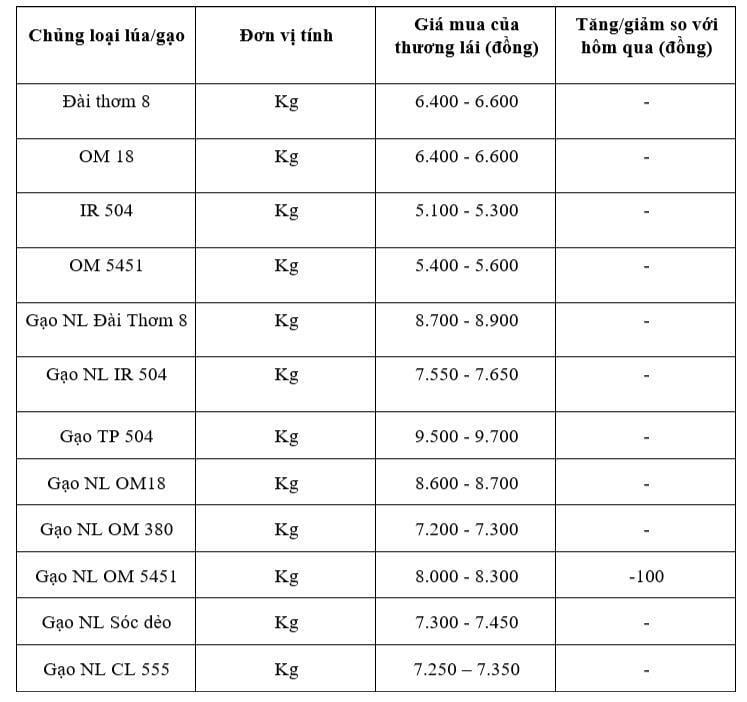 Với mặt hàng gạo, theo cập nhật từ Sở Nông nghiệp và Môi trường tỉnh An Giang và Lúa gạo Việt, hiện gạo nguyên liệu xuất khẩu OM 5451 giảm 100 đồng/kg dao động ở mức 8.000 - 8.300 đồng/kg; gạo nguyên liệu xuất khẩu Sóc dẻo dao động ở mức 7.300 - 7.450; gạo nguyên liệu xuất khẩu IR 504 dao động ở mức 7.550 - 7.650 đồng/kg; gạo nguyên liệu xuất khẩu CL 555 dao động ở mức 7.340 - 7.450 đồng/kg; gạo Đài Thơm 8 dao động 8.700 - 8.900 đồng/kg; gạo nguyên liệu xuất khẩu OM 380 dao động ở mức 7.200 - 7.300 đồng/kg; gạo nguyên liệu xuất khẩu OM 18 dao động ở mức 8.500 - 8.600 đồng/kg; gạo thành phẩm IR 504 dao động ở 9.500 - 9.700 đồng/kg so với hôm qua.