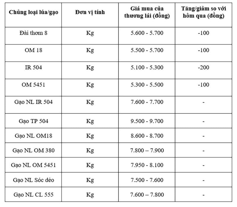 Với mặt hàng gạo, theo cập nhật từ Sở Nông nghiệp và Môi trường tỉnh An Giang và Lúa gạo Việt, hiện gạo nguyên liệu xuất khẩu IR 504 dao động ở mức 7.600 - 7.700 đồng/kg; gạo nguyên liệu xuất khẩu Sóc dẻo dao động ở mức 7.500 - 7.600; gạo nguyên liệu xuất khẩu OM 5451 dao động ở mức 7.950 - 8.100 đồng/kg; gạo nguyên liệu xuất khẩu CL 555 dao động ở mức 7.600 - 7.800 đồng/kg; gạo nguyên liệu xuất khẩu OM 18 dao động ở mức 8.500 - 8.600 đồng/kg; gạo nguyên liệu xuất khẩu OM 380 dao động ở mức 7.800 - 7.900 đồng/kg; gạo thành phẩm OM 380 dao động ở 8.800 - 9.000 đồng/kg; gạo thành phẩm IR 504 dao động ở 9.500 - 9.700 đồng/kg so với hôm qua.