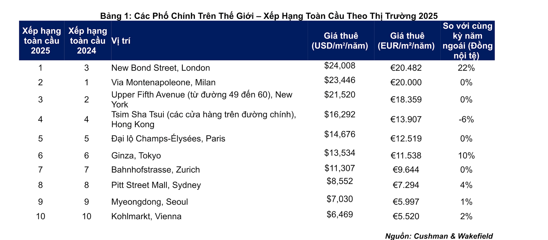 Báo cáo bán lẻ toàn cầu của Cushman & Wakefield chỉ ra, các tuyến phố chính trên thế giới, tập trung vào mức thuê mặt bằng cao nhất tại các vị trí đô thị hàng đầu, phần lớn trong số đó liên quan đến ngành hàng xa xỉ.