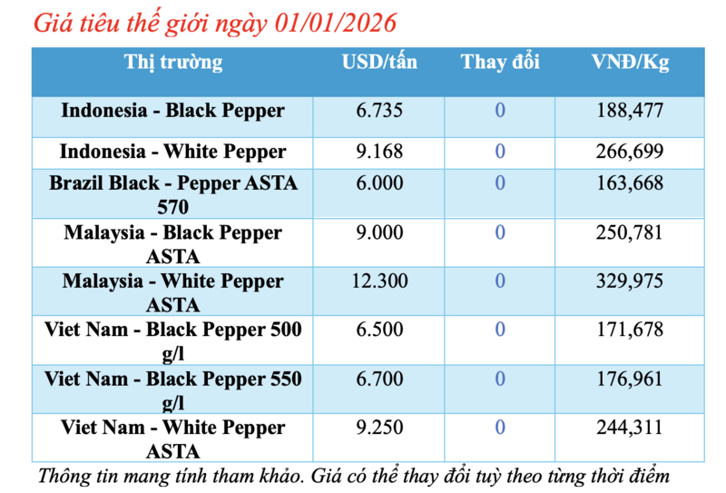 Cập nhật giá tiêu thế giới từ Hiệp hội Hồ tiêu Quốc tế (IPC) sáng 01/01/2026, hồ tiêu xuất khẩu hôm nay không ghi nhận biến động. Các thị trường đều ổn định giá so với phiên giao dịch hôm qua.