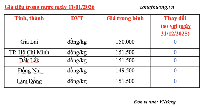 Trong khi đó, giá tiêu thị trường trong nước hôm nay (01/01) cũng không ghi nhận biến động so với ngày hôm qua. Hiện giá tiêu trong nước dao động trong khoảng 149.500 - 151.500 đồng/kg.