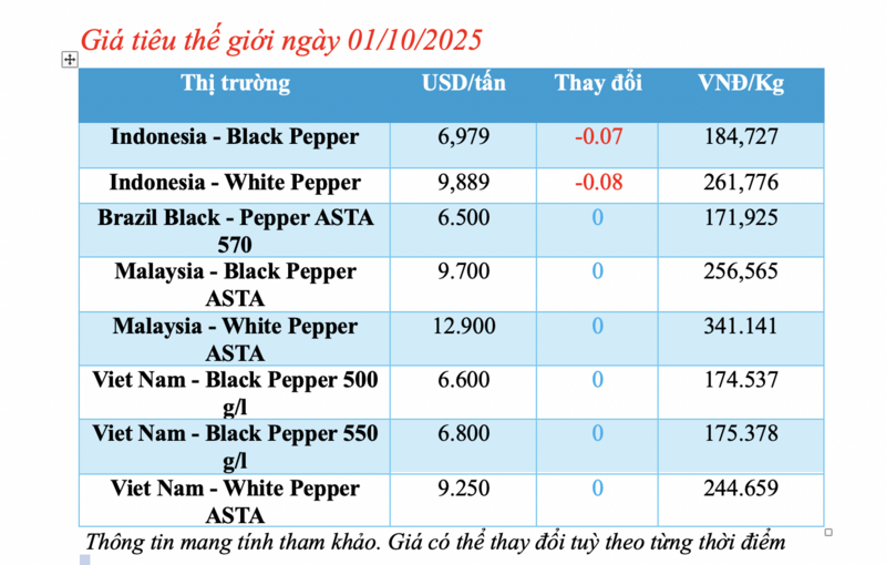 Cập nhật giá tiêu thế giới từ Hiệp hội Hồ tiêu Quốc tế (IPC) lúc 4 giờ 30 phút sáng 01/10/2025, thị trường hồ tiêu xuất khẩu hôm nay ghi nhận sự giảm nhẹ của thị trường Indonesia.