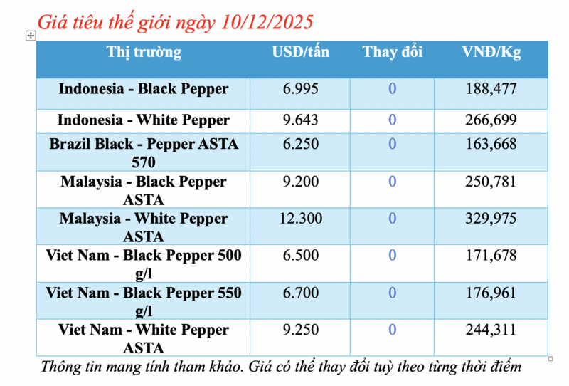 Cập nhật giá tiêu thế giới từ Hiệp hội Hồ tiêu Quốc tế (IPC) sáng 10/12/2025, hồ tiêu xuất khẩu hôm nay không ghi nhận biến động. Các thị trường đều ổn định giá so với phiên giao dịch hôm qua.