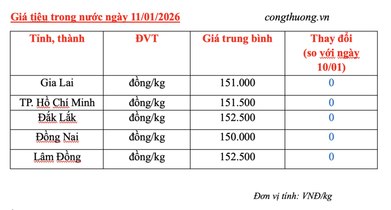 Trong khi đó, giá tiêu thị trường trong nước hôm nay (11/01) tiếp tục giữ ổn định. Hiện giá tiêu trong nước dao động từ 150.000 - 152.500 đồng/kg.