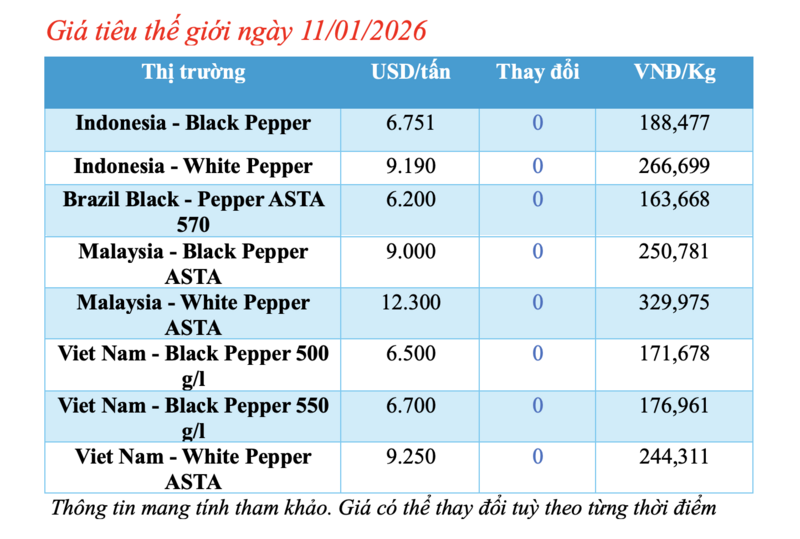 Cập nhật giá tiêu thế giới từ Hiệp hội Hồ tiêu Quốc tế (IPC) sáng 11/01/2026, hồ tiêu xuất khẩu hôm nay không ghi nhận biến động mới. Các thị trường đều ổn định giá so với phiên giao dịch hôm qua.