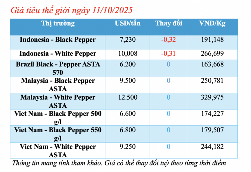 Cập nhật giá tiêu thế giới từ Hiệp hội Hồ tiêu Quốc tế (IPC) lúc 4 giờ 30 phút sáng 11/10/2025, thị trường hồ tiêu xuất khẩu hôm nay tiếp tục ghi nhận sự biến động nhẹ tại thị trường Indonesia.