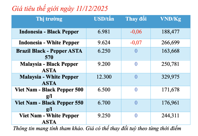 Cập nhật giá tiêu thế giới từ Hiệp hội Hồ tiêu Quốc tế (IPC) sáng 11/12/2025, hồ tiêu xuất khẩu hôm nay ghi nhận biến động nhẹ tại thị trường Indonesia. Các thị trường khác đều ổn định giá so với phiên giao dịch hôm qua.