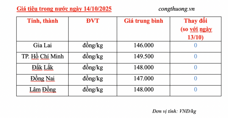 Giá tiêu hôm nay (14/10/2025) được cập nhật vào lúc 4 giờ 30 phút cho thấy thị trường trong nước không biến động với hôm qua. Hiện giá tiêu ở mức 146.000 - 149.500 đồng/kg.