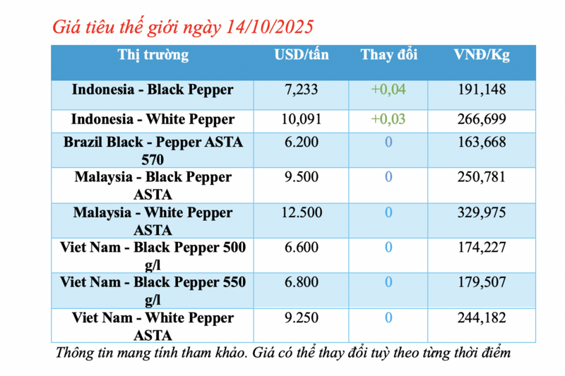 Cập nhật giá tiêu thế giới từ Hiệp hội Hồ tiêu Quốc tế (IPC) lúc 4 giờ 30 phút sáng 14/10/2025, thị trường hồ tiêu xuất khẩu hôm nay ghi nhận sự biến động nhẹ từ thị trường Indonesia.