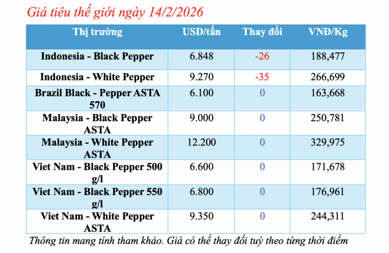Cập nhật giá tiêu thế giới từ Hiệp hội Hồ tiêu Quốc tế (IPC) sáng 14/2/2026, hồ tiêu xuất khẩu hôm nay ghi nhận biến động mới từ thị trường Indonesia. Các thị trường khác đều duy trì mức giá ổn định so với phiên giao dịch hôm qua.