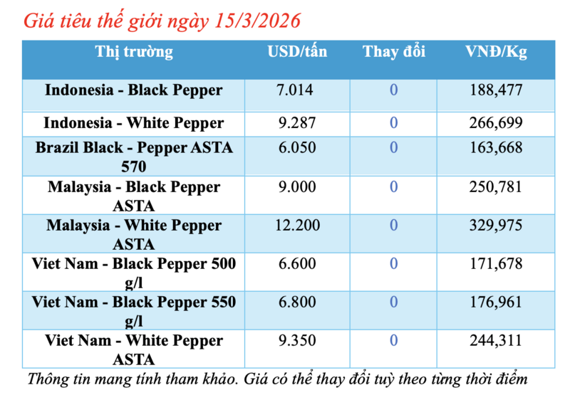 Giá tiêu thế giới hôm nay 15/3/2026: Đi ngang