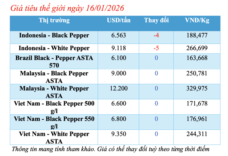margin: 1em 0px; color: #333333; font-family: Arial, 'Helvetica Neue', Helvetica, sans-serif; font-size: 18px; font-style: normal; font-variant-ligatures: normal; font-variant-caps: normal; font-weight: normal; letter-spacing: normal; orphans: 2; text-align: justify; text-indent: 0px; text-transform: none; widows: 2; word-spacing: 0px; -webkit-text-stroke-width: 0px; white-space: normal; text-decoration: none; text-size-adjust: auto; caret-color: #333333; background-color: #ffffff;">Giá hồ tiêu thế giới 16/01/2026: Giảm nhẹ tại Indonesia