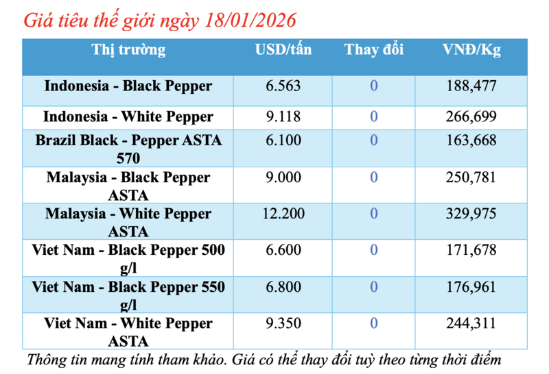 Cập nhật giá tiêu thế giới từ Hiệp hội Hồ tiêu Quốc tế (IPC) sáng 18/01/2026, hồ tiêu xuất khẩu hôm nay không ghi nhận biến động mới. Các thị trường duy trì ổn định so với phiên giao dịch hôm qua.