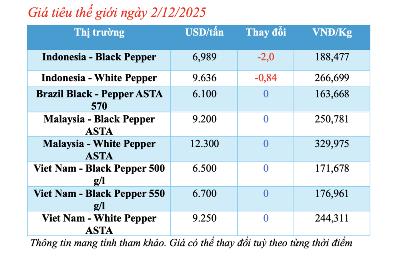 Cập nhật giá tiêu thế giới từ Hiệp hội Hồ tiêu Quốc tế (IPC) sáng 2/12/2025, hồ tiêu xuất khẩu hôm nay ghi nhận biến động mạnh tại thị trường Indonesia. Các thị trường khác đều ổn định giá so với phiên giao dịch hôm qua.