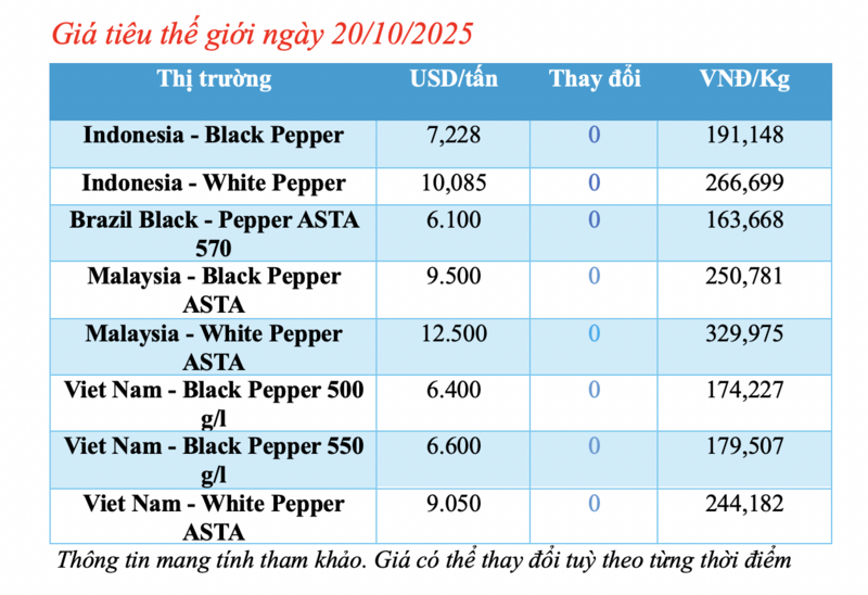 Cập nhật giá tiêu thế giới từ Hiệp hội Hồ tiêu Quốc tế (IPC) lúc 4 giờ 30 phút sáng 20/10/2025, thị trường hồ tiêu xuất khẩu hôm nay đi ngang, không ghi nhận sự biến động so với hôm qua.
