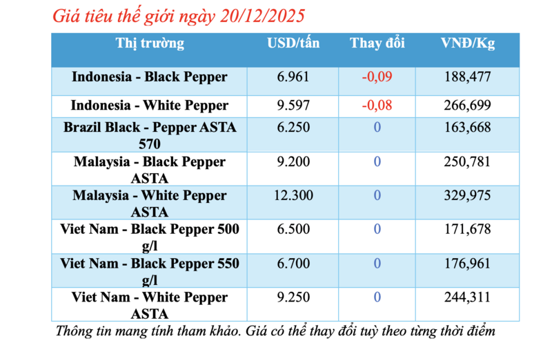 Cập nhật giá tiêu thế giới từ Hiệp hội Hồ tiêu Quốc tế (IPC) sáng 20/12/2025, hồ tiêu xuất khẩu hôm nay ghi nhận biến động nhẹ tại thị trường Indonesia. Các thị trường khác đều ổn định giá so với phiên giao dịch hôm qua.