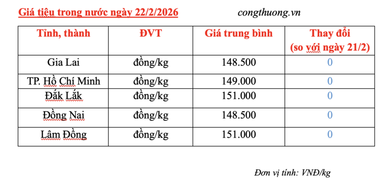 Trong khi đó, giá tiêu thị trường trong nước hôm nay (22/2) không ghi nhận phiên điều chỉnh mới. Hiện giá tiêu trong nước dao động trong khoảng 148.500 - 151.000 đồng/kg.