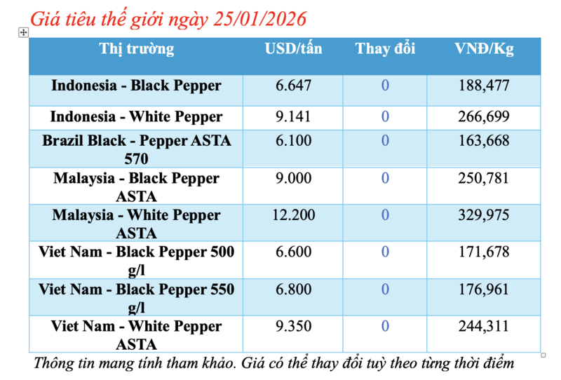 Cập nhật giá tiêu thế giới từ Hiệp hội Hồ tiêu Quốc tế (IPC) sáng 25/01/2026, hồ tiêu xuất khẩu hôm nay không ghi nhận biến động mới. Các thị trường đều duy trì mức giá ổn định so với phiên giao dịch hôm qua.