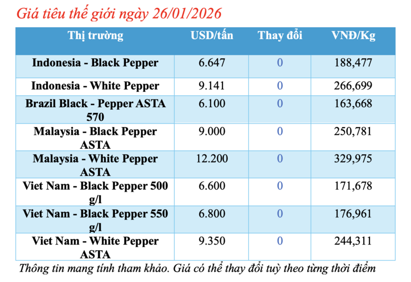 Cập nhật giá tiêu thế giới từ Hiệp hội Hồ tiêu Quốc tế (IPC) sáng 26/01/2026, hồ tiêu xuất khẩu hôm nay không ghi nhận biến động mới. Các thị trường đều duy trì mức giá ổn định so với phiên giao dịch hôm qua.