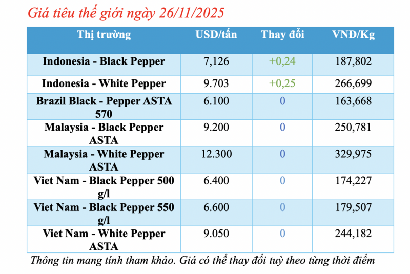 Cập nhật giá tiêu thế giới từ Hiệp hội Hồ tiêu Quốc tế (IPC) sáng 26/11/2025, hồ tiêu xuất khẩu hôm nay ghi nhận biến động mạnh tại Indonesia. Các thị trường khác đều ổn định giá so với phiên giao dịch hôm qua.