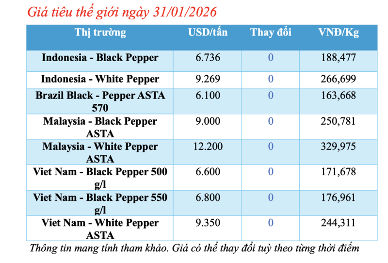 Cập nhật giá tiêu thế giới từ Hiệp hội Hồ tiêu Quốc tế (IPC) sáng 31/01/2026, hồ tiêu xuất khẩu hôm nay không ghi nhận biến động mới. Các thị trường đều duy trì mức giá ổn định so với phiên giao dịch hôm qua.