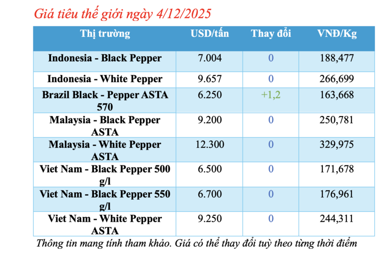 Cập nhật giá tiêu thế giới từ Hiệp hội Hồ tiêu Quốc tế (IPC) sáng 4/12/2025, hồ tiêu xuất khẩu hôm nay ghi nhận biến động mạnh tại thị trường Brazil. Các thị trường khác đều ổn định giá so với phiên giao dịch hôm qua.