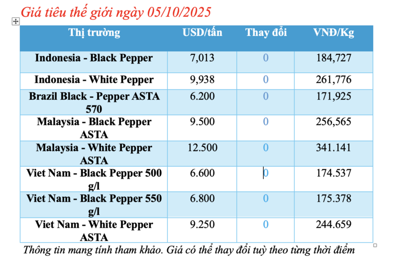 Cập nhật giá tiêu thế giới từ Hiệp hội Hồ tiêu Quốc tế (IPC) lúc 4 giờ 30 phút sáng 5/10/2025, thị trường hồ tiêu xuất khẩu hôm nay không ghi nhận sự biến động.