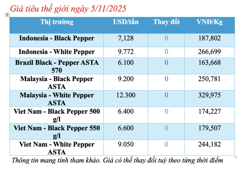 Cập nhật giá tiêu thế giới từ Hiệp hội Hồ tiêu Quốc tế (IPC) lúc 4 giờ 30 phút sáng 5/11/2025, hồ tiêu xuất khẩu hôm nay không ghi nhận biến động. Các thị trường đều ổn định giá so với hôm qua.