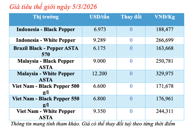 Giá tiêu thế giới hôm nay 5/3/2026: Lặng sóng