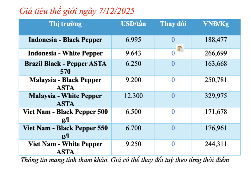 Cập nhật giá tiêu thế giới từ Hiệp hội Hồ tiêu Quốc tế (IPC) sáng 7/12/2025, hồ tiêu xuất khẩu hôm nay không ghi nhận biến động. Các thị trường đều ổn định giá so với phiên giao dịch hôm qua.