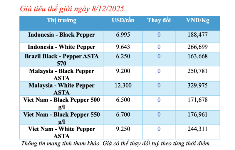 Cập nhật giá tiêu thế giới từ Hiệp hội Hồ tiêu Quốc tế (IPC) sáng 8/12/2025, hồ tiêu xuất khẩu hôm nay không ghi nhận biến động. Các thị trường đều ổn định giá so với phiên giao dịch hôm qua.
