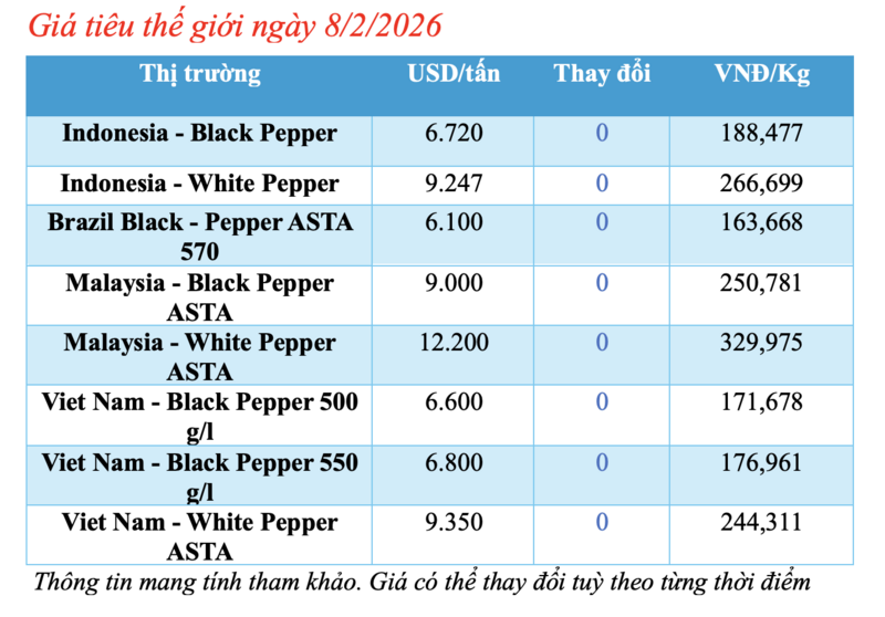 Cập nhật giá tiêu thế giới từ Hiệp hội Hồ tiêu Quốc tế (IPC) sáng 8/2/2026, hồ tiêu xuất khẩu hôm nay không ghi nhận biến động mới. Các thị trường đều duy trì mức giá ổn định so với phiên giao dịch hôm qua.