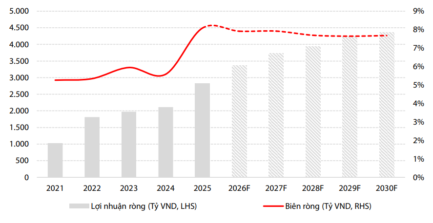 margin: 15px auto;" />Theo VDSC, doanh thu của PNJ dự kiến đạt khoảng 42.500 tỷ đồng trong năm 2026, tăng 21,5% so với năm trước, trong khi lợi nhuận sau thuế thuộc về cổ đông công ty mẹ ước đạt 3.364 tỷ đồng, tăng 18,9% so với cùng kỳ. Biên lợi nhuận ròng theo đó duy trì ở mức 7,9%, chỉ giảm nhẹ 0,2 điểm phần trăm so với nền cao của năm 2025. Nếu nhìn trong giai đoạn 2026–2030, tốc độ tăng trưởng kép của doanh nghiệp được ước tính đạt khoảng 10,2% mỗi năm, phản ánh kỳ vọng phục hồi ổn định sau giai đoạn chịu áp lực từ nguồn cung nguyên liệu và sức mua suy yếu.