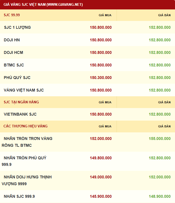 Giá vàng SJC được Công ty TNHH MTV Vàng bạc đá quý Sài Gòn - SJC, Bảo Tín Minh Châu, Tập đoàn DOJI cùng niêm yết giá vàng ở mức 150,8-152,8 triệu đồng/lượng (mua vào - bán ra), mức giá giữ nguyên ở cả hai chiều mua - bán so với hôm qua. Chênh lệch giá mua vào - bán ra ở mức 2 triệu đồng.