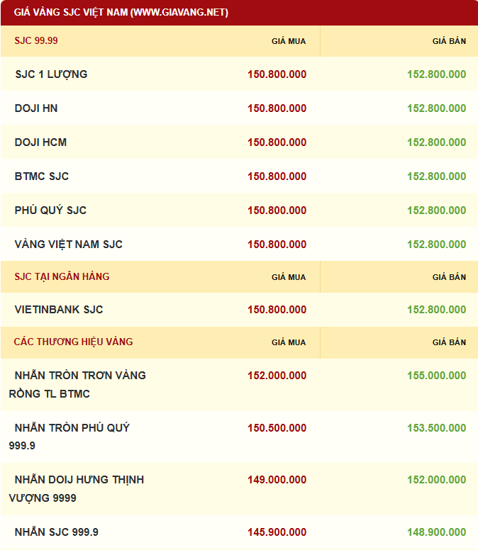 Giá vàng SJC được Công ty TNHH MTV Vàng bạc đá quý Sài Gòn - SJC niêm yết ở ngưỡng 150,8-152,8 triệu đồng/lượng (mua vào - bán ra), chênh lệch giá mua vào - bán ra ở mức 2 triệu đồng.