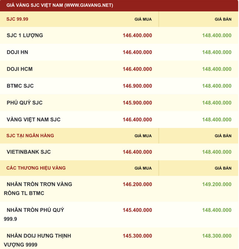 Giá vàng miếng được Công ty TNHH MTV Vàng bạc đá quý Sài Gòn - SJC, Tập đoàn DOJI, PNJ cùng niêm yết giá vàng ở mức 146,4 - 148,4 triệu đồng/lượng (mua vào - bán ra), mức giá tăng 600 nghìn đồng/lượng ở cả hai chiều mua - bán so với hôm qua.