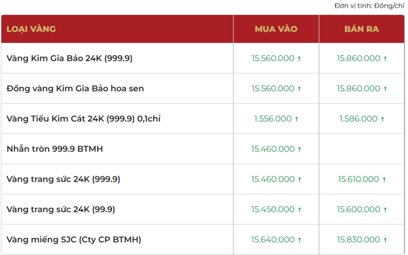 Giá vàng Kim Gia Bảo tại Bảo Tín Mạnh Hải niêm yết ở mức 155,6-158,6 triệu đồng/lượng tăng 800.000 đồng/lượng ở cả hai chiều mua vào - bán ra. Biên độ mua bán vàng ở mức 3 triệu đồng/lượng.