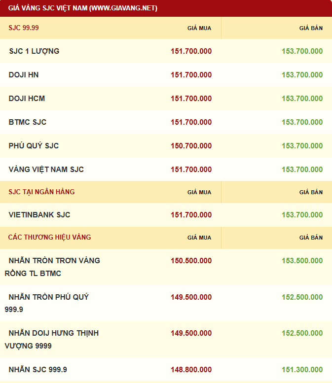 Giá vàng miếng được Công ty TNHH MTV Vàng bạc đá quý Sài Gòn - SJC, Bảo Tín Minh Châu, PNJ cùng niêm yết giá vàng ở mức 151,7 - 153,7 triệu đồng/lượng (mua vào - bán ra), mức giá giảm mạnh 800.000 đồng/lượng so với chốt phiên giao dịch ngày hôm qua.