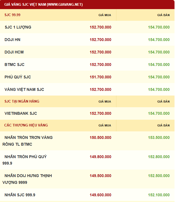 Giá vàng miếng được Công ty TNHH MTV Vàng bạc đá quý Sài Gòn - SJC, Bảo Tín Minh Châu, PNJ, Tập đoàn DOJI cùng niêm yết giá vàng ở mức 152,7 - 154,7 triệu đồng/lượng (mua vào - bán ra), mức giá tăng 1 triệu đồng/lượng so với chốt phiên giao dịch ngày hôm qua.