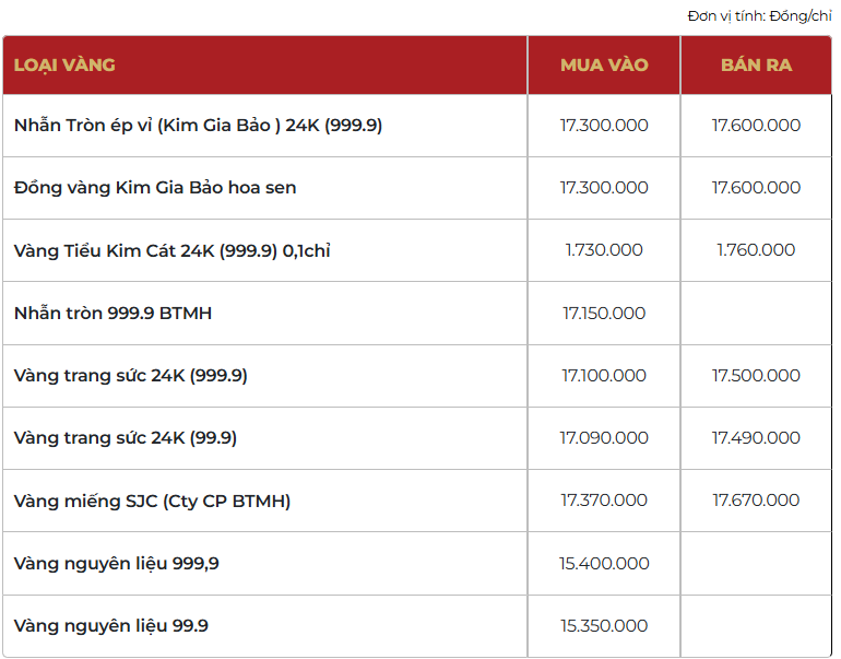 Bảo Tín Mạnh Hải niêm yết giá nhẫn tròn ép vỉ Kim Gia Bảo ở mức 173 - 176 triệu đồng/lượng (mua vào - bán ra), tăng 2 triệu đồng/lượng cả hai chiều mua vào và bán ra so với chốt phiên giao dịch trước.
