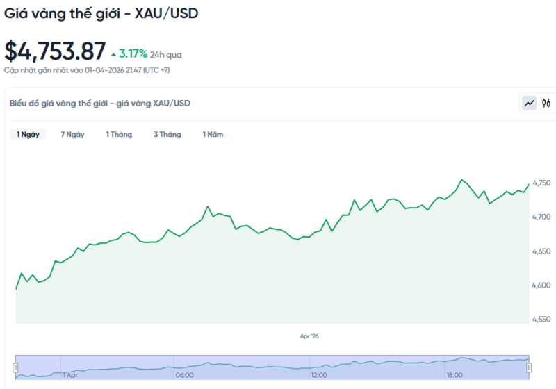 Theo Kitco, giá vàng thế giới ghi nhận lúc 4h30 hôm nay theo giờ Việt Nam giao ngay ở mức 4,753.87 USD/ounce. Giá vàng hôm nay tăng 3,17% so với hôm qua. Quy đổi theo tỷ giá USD trên thị trường tự do (26.809 VND/USD), vàng thế giới có giá khoảng 153,6 triệu đồng/lượng (chưa tính thuế, phí). Như vậy, giá vàng miếng SJC đang cao hơn giá vàng quốc tế khoảng 23 triệu đồng/lượng.