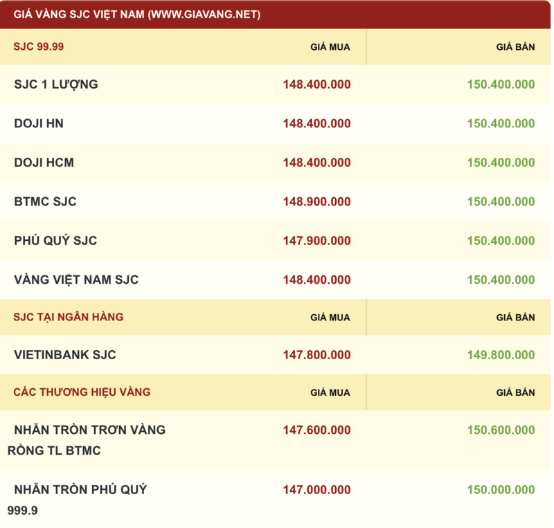 Giá vàng miếng được Công ty TNHH MTV Vàng bạc đá quý Sài Gòn - SJC, Tập đoàn DOJI, PNJ cùng niêm yết giá vàng ở mức 148,4 - 150,4 triệu đồng/lượng (mua vào - bán ra), mức giá tăng 600 nghìn đồng/lượng ở cả hai chiều mua - bán so với hôm qua.