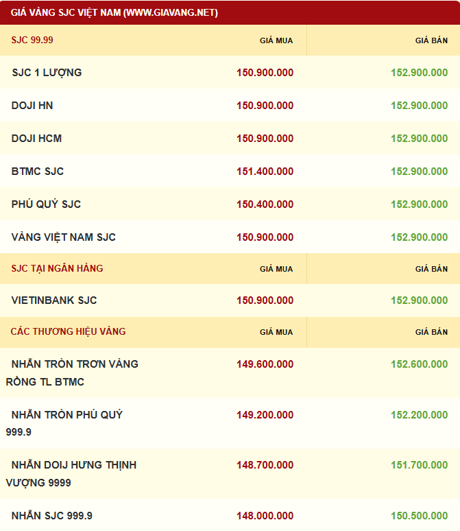 Giá vàng miếng được Công ty TNHH MTV Vàng bạc đá quý Sài Gòn - SJC, Bảo Tín Minh Châu, PNJ và Tập đoàn DOJI cùng niêm yết giá vàng ở mức 150,9 - 152,9 triệu đồng/lượng (mua vào - bán ra), mức giá tăng 2,5 triệu đồng/lượng ở cả hai chiều mua - bán so với hôm qua.