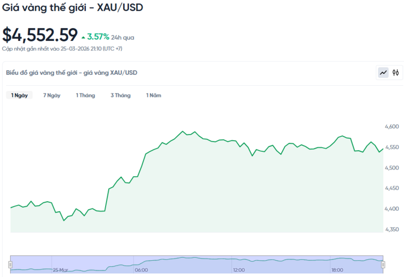 Theo Kitco, giá vàng thế giới ghi nhận lúc 4h30 hôm nay theo giờ Việt Nam giao ngay ở mức 4,552.59 USD/ounce. Giá vàng hôm nay tăng 3,57% so với hôm qua. Quy đổi theo tỷ giá USD trên thị trường tự do (26.930 VND/USD), vàng thế giới có giá khoảng 147,8 triệu đồng/lượng (chưa tính thuế, phí). Như vậy, giá vàng miếng SJC đang cao hơn giá vàng quốc tế khoảng 25,7 triệu đồng/lượng.