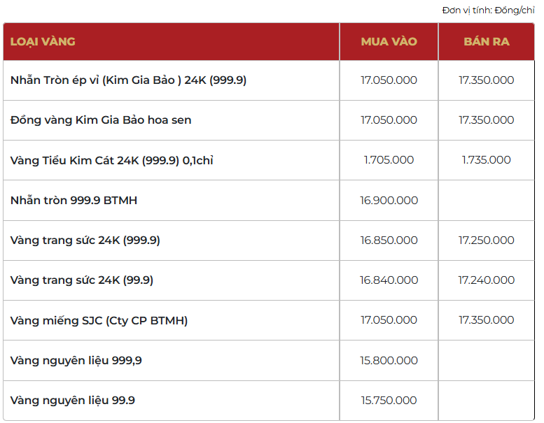 Bảo Tín Mạnh Hải niêm yết giá nhẫn tròn ép vỉ Kim Gia Bảo ở mức 172,5 - 175,5 triệu đồng/lượng (mua vào - bán ra), tăng 4,8 triệu đồng/lượng cả hai chiều mua vào và bán ra so với chốt phiên giao dịch trước.