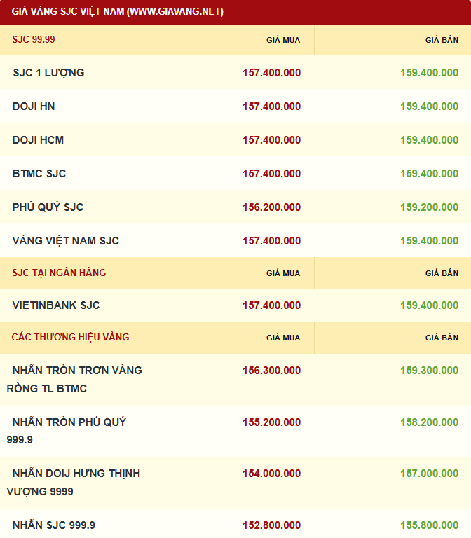 Giá vàng miếng được Công ty TNHH MTV Vàng bạc đá quý Sài Gòn - SJC, Bảo Tín Minh Châu, PNJ, Tập đoàn DOJI cùng niêm yết giá vàng ở mức 157,2-159,2 triệu đồng/lượng (mua vào - bán ra), mức giá tăng 400.000 đồng/lượng ở cả hai chiều mua - bán so với hôm qua. Chênh lệch giá mua vào - bán ra ở mức 2 triệu đồng.